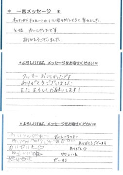 特にお菓子つくりでは、作っている最中に「甘い香り最高」や「何をつくってるの?」など利用者さんから直接声をかけていただいたり、滞在しているきょうだいの方が「ありがとうございます。ありがと💙やさしいね。だいすき」と書かれたアンケートを見てとてもうれしかったです。また、チェックインされる際、ご案内したご家族が後の利用者アンケートに「初めて利用したけど、チェックインの方が優しくて安心して利用できました。」と書いていただいた事もとてもうれしかったです。笑顔でハウスを出られてお家に帰られる時はすごくうれしい瞬間です。