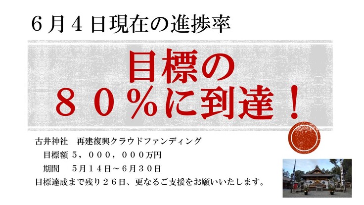 6月1日の進捗報告に続き、本日6月4日現在80%に到達しました。これもひとえに皆様の温かく力強いご支援のお気持ちの賜物と感謝申し上げます。残りの期間がまだ26日ございますが、引き続きご支援の輪が広がりますようお願いいたします。