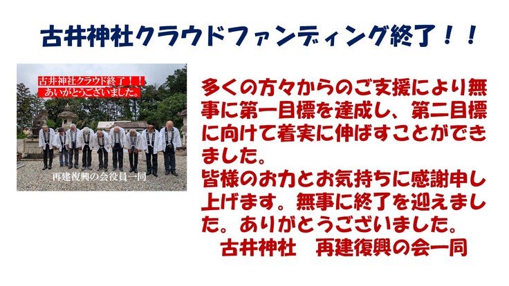古井神社再建復興に向けたクラウドファンディングが無事に終了いたしました。これもひとえに皆様方のご支援の賜物と感謝申し上げます。