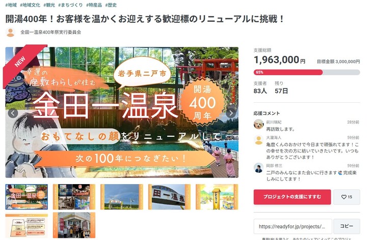 枋ノ木神社移転クラファンも金田一温泉温泉開湯400年クラファンもどちらも成功して二戸市を盛り上げていきたいと考えております!