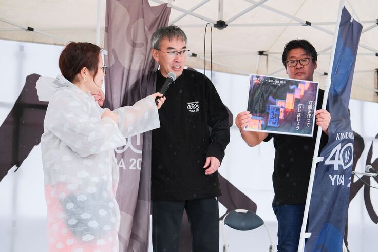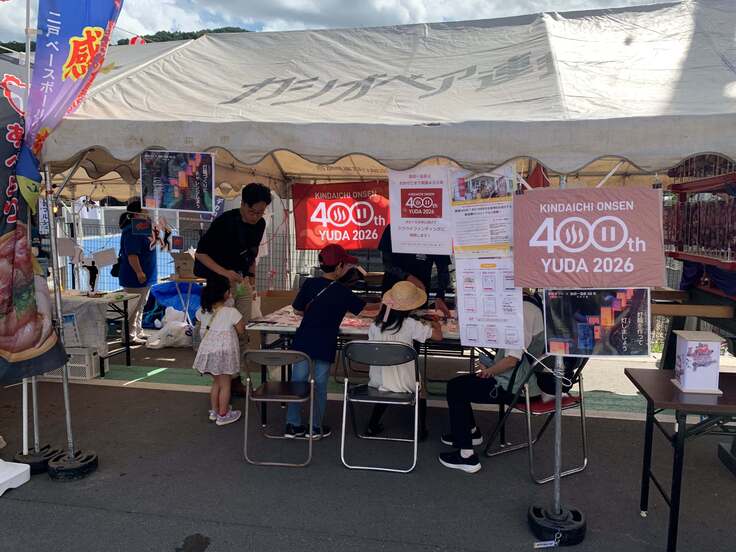 初日の大雨の中駆けつけていただいた来場者に金田一温泉の開湯400年PRとクラウドファンディングスタートの告知も行っていただきました。