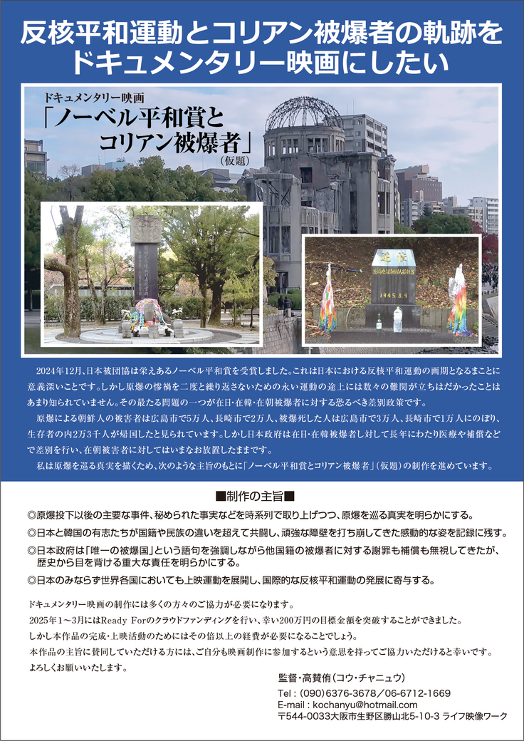 ◎Ready Forのクラウドファンディングは終了しましたが、そちらに掲載されていた制作主旨やリターンの詳細などは引き続きReady Forのホームページからご覧になることができます。https://readyfor.jp/projects/kochanyu。また「ワタシタチハニンゲンダ!」ホームページに設けたバナー「ノーベル平和賞とコリアン被爆者」(仮題)からも見ることができます。