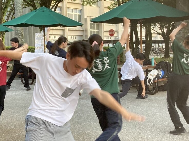 高知大学演舞場の会場で練習をしているよさこい学生チーム叢雲にお願いをして、リハーサル的に南から北に向けて踊ってもらいました。