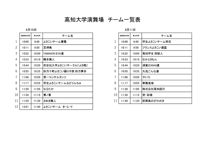 高知大学演舞場でよさこいチームの踊りを披露する順番を一覧表にしました。