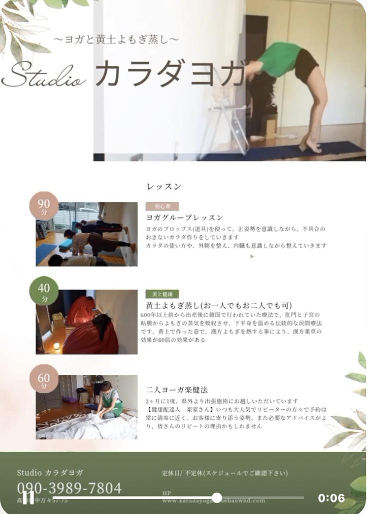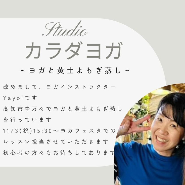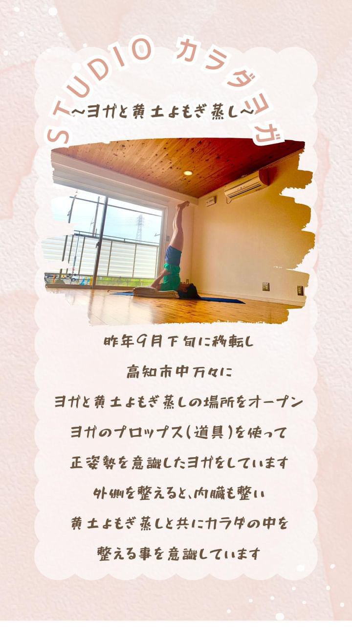 日頃は【Studio カラダヨガ】の名前で中万々などでヨガレッスン、黄土よもぎ蒸し、各種イベントなどを行っております