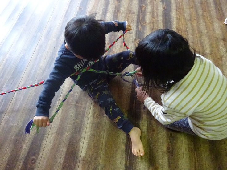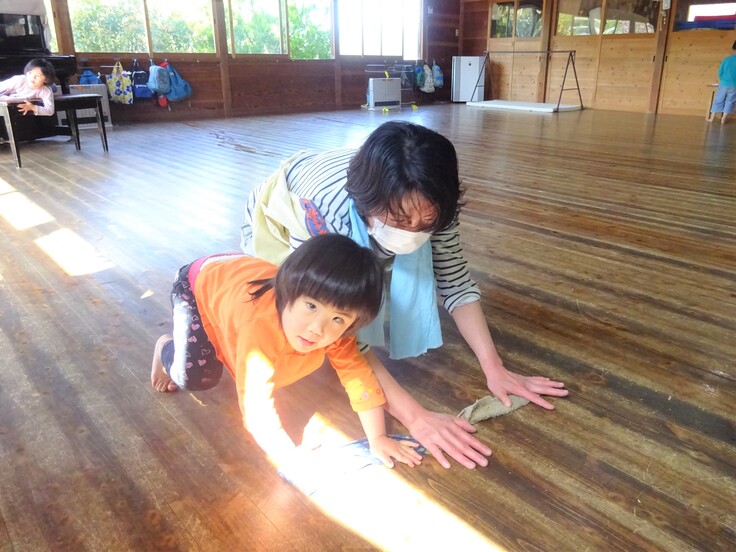 子どもたちの朝は、ロールマットで体のゆがみを整え、雑巾がけからスタート。こどもの森の子たちは、園舎の中では裸足で過ごします。足の裏からたくさん刺激をもらうことで、強い身体と脳の発達が育まれる、と考えるからです。