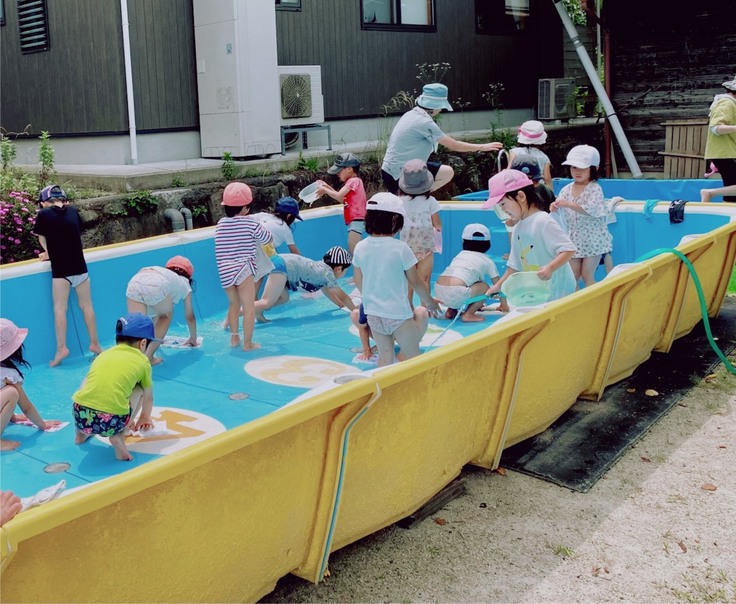 週末に保護者の皆様のお力を借りて、プールを出しました。