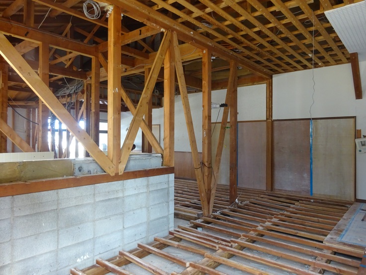 今回大きくする調理室は、床や不要な壁が壊され新しい間取りに仕切られていました。子どもたちの大好きな調理室は、中の様子が見えるよう、子どもたちの通る所はプラスチックのガラス張りになる予定です。