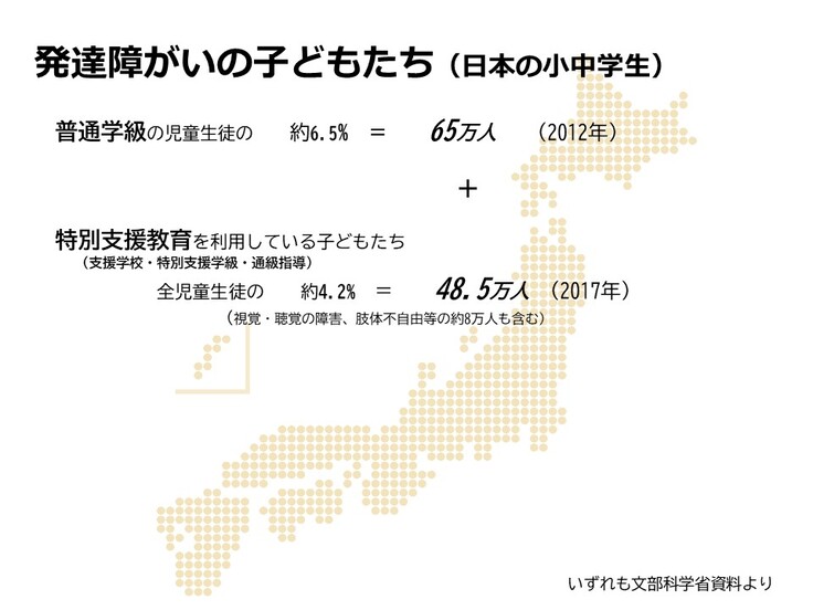 平成24年に文部科学省が行った調査では、通常学級に所属する知的な遅れがない小中学生のうち、約6.5%に発達障がいの可能性があり、これは当時の人口統計からは約65万人にあたります。支援学級や特別支援学校に所属する、より重度の子どもたちをあわせると、さらに多くの子どもたちが発達の困難をかかえていることになります。