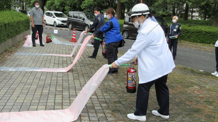 水の入った消火器を使う訓練が多い中、今回は本物の粉末状の消火剤の入った消火器を使った訓練を実施しました。参加者からは「消火器にピンクの粉が入っていることを知ってびっくりした。」「今日初めて消火器を操作したが難しくなかった。いざというときでも、これまでより自信をもって使えると思う。」といった声が上がっていました。