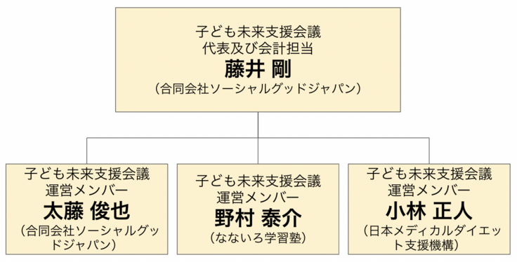 このプロジェクトを立ち上げた「子ども未来支援会議」は、岡山にある「発達障害(ADHD、ASD、LD)や不登校のお子様の高校進学をゴールに寄り添う新しい学習塾『なないろ』」を運営している野村泰介(のむらたいすけ)と、日本メディカルダイエット支援機構の理事長である小林正人(こばやしまさと)そして社会に役立ソーシャルグッドな活動をしている人や団体、企業を支援する合同会社ソーシャルグッドジャパンの太藤俊也の出会いからスタートしました。 ここでは、こうした子どもの学習支援をはじめとする「子どもの未来」について、広く考え社会課題に取り組む団体です。