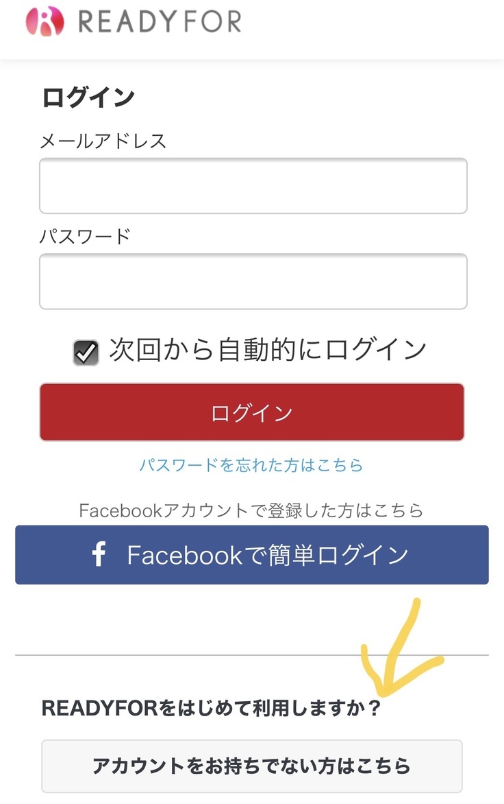 【STEP2-1】 readyforアカウント登録>「アカウントをお持ちでない方はこちら」をクリック