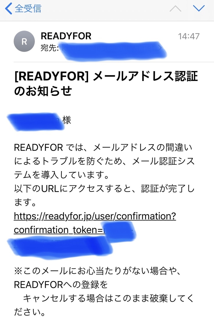 【STEP2-3】 readyforアカウント登録>READYFORからメールが送信されるので,メールを確認。メール中のURLをクリック