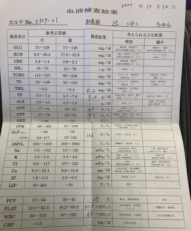 ビリルビンは前回に続き、基準値内におさまっています。そして何より、肝機能の値の回復がめざましいです…!GOT、GPTともに基準値内でした。感動です…。肝臓のお薬の投薬もあと少し残っている分を投薬し切ったら一時中断し、このまま安定するのか、それともまた悪くなってしまうのか…様子を見ることになりました。