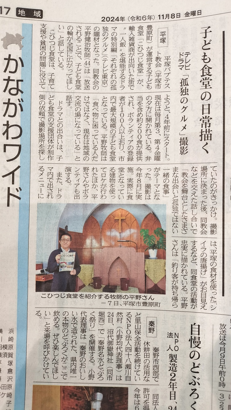 11月8日の神奈川新聞で、私たちの食堂のこと、テレビ放送の件が、紹介されました!