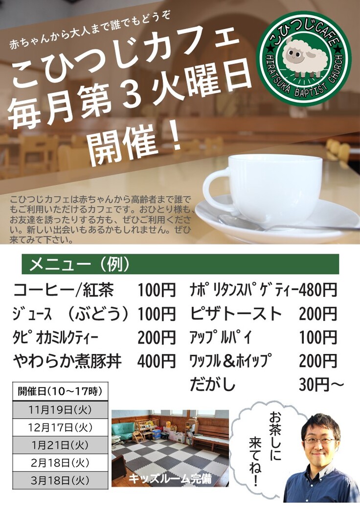 平塚バプテスト教会では「こひつじ食堂」だけではなく「こひつじカフェ」を開催しています。カフェは平日の10時~17時まで開催しております。平日の日中で、高齢者の方や、放課後のこどもなどが利用いただいています。このような活動からも、孤立や孤独を防ぎたいと思っています。このような活動にも冷蔵庫、イスを使っています。