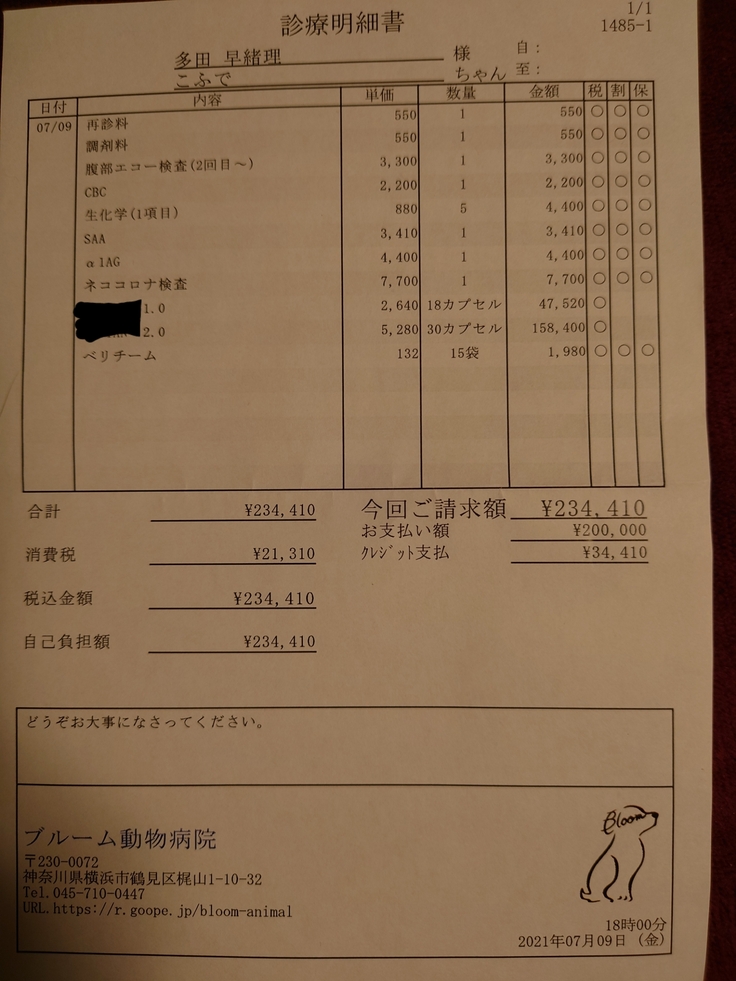 1日13,200円×14日分で184,800円、予備の100mg×3カプセルで7,920円。