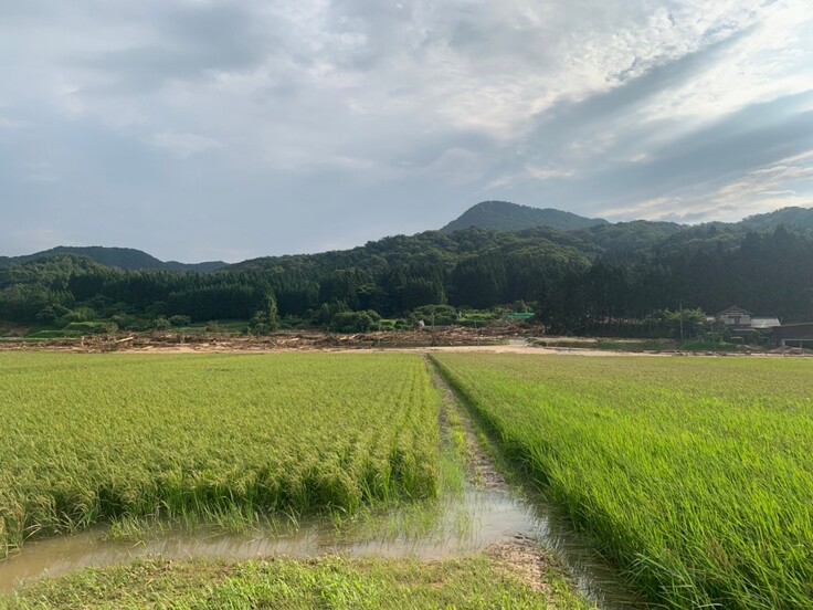 ▲コシヒカリの田んぼ。奥の山手には今回の土石流で流された大量の木々が見える。