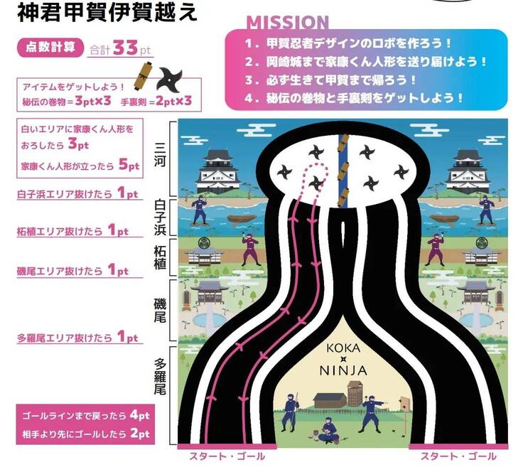 こうかにんじゃロボコンのコースは、甲賀流忍者の「神君甲賀伊賀越え」をテーマにしています。