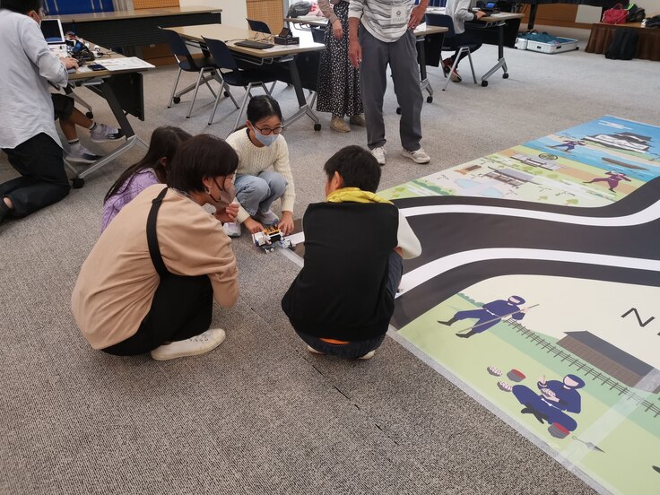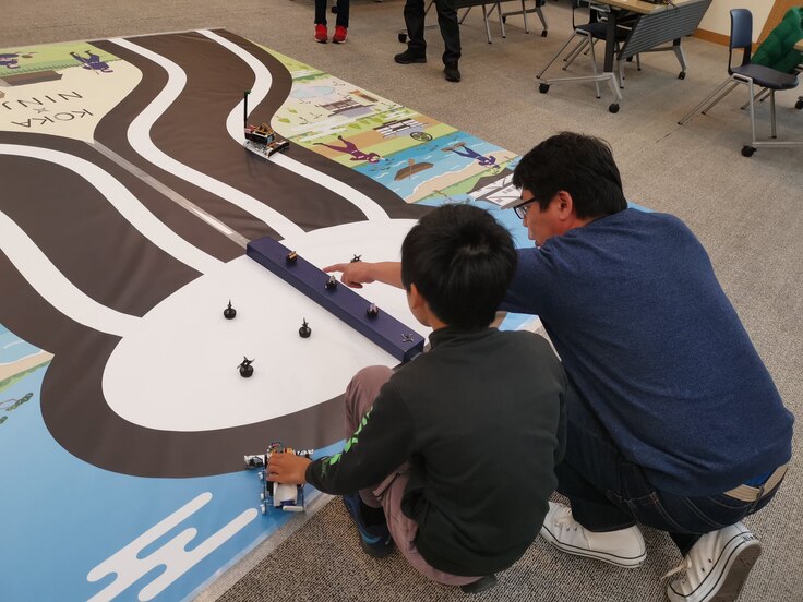 子どもたちのロボットがスムーズに帰ってくるのを見ながら、自分のロボットがくるくる回るのを頭を抱えながら見守ります。