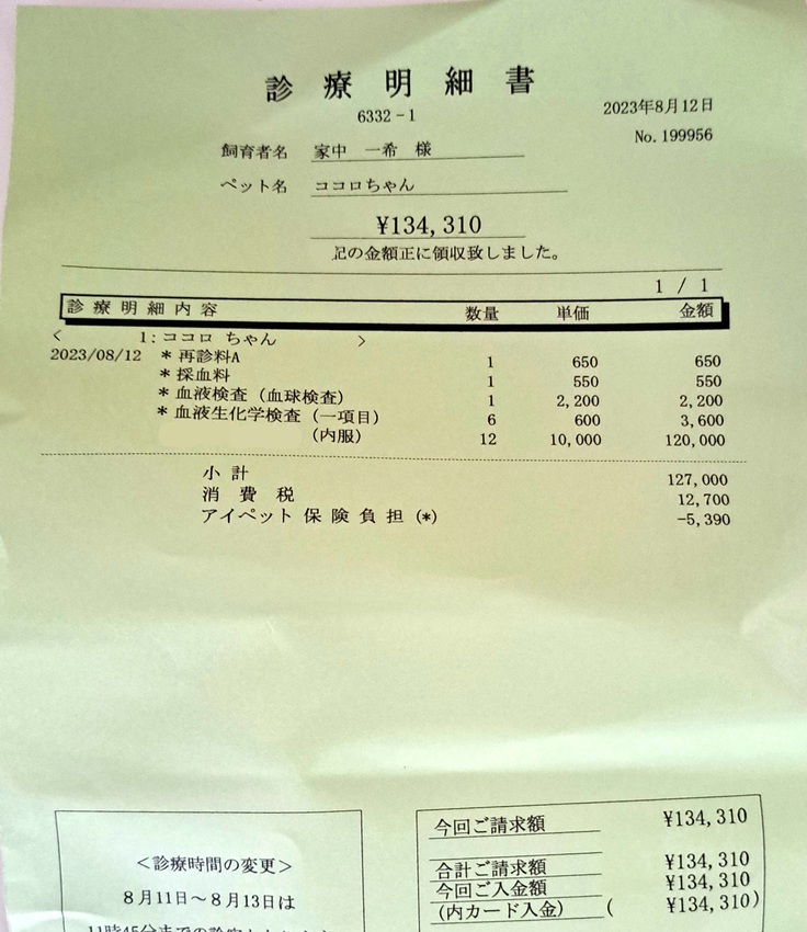 本日は定期検診がありました。最近はココロも元気にしているので、特に心配はしませんでした。血液検査の結果特に問題はないとのことです。あと少しで投薬期間(8月31日予定)が終わるので、そこまでとりあえず頑張っていくのみです。そして、そこからが非常に重要で再発しないことを祈ることです。