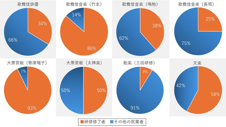 研修修了後は、実際の舞台での経験を積みながら、伝統芸能の伝承者としてさらに研鑽を重ね、現在、300名もの研修修了者が、それぞれの舞台で活躍しています。現役の歌舞伎俳優の3割以上、歌舞伎音楽竹本の9割以上、文楽技芸員の5割以上を研修修了者が占めており、国立劇場の伝承者養成事業がないと、伝統芸能の公演が成り立たないといっても過言ではありません。