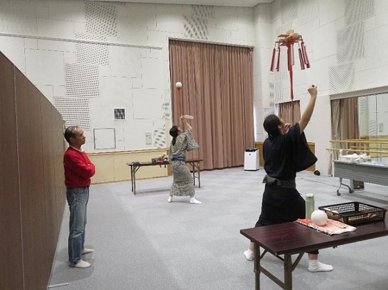 「副科(笛、太鼓、三味線、舞踊、体操、講義)は、獅子舞のお囃子と今後の仕事の助けになるので頑張ってね」とアドバイスをいただいた研修生。