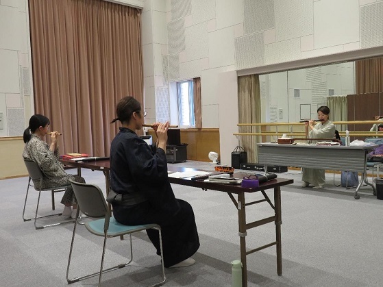 研修では、能管と篠笛を望月美沙輔(もちづき・みさほ)先生にご指導いただき、「老松」をお稽古しました。