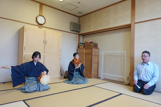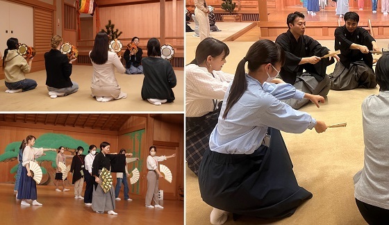 学生のみなさんには、シテ方・小鼓方・狂言方の3つを体験していただきました。
