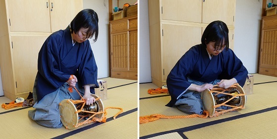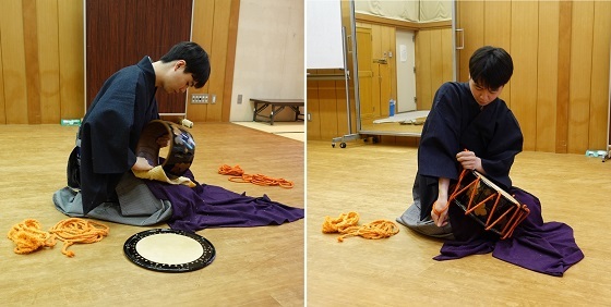 途中からは普段通り太鼓を組んでいくのですが、新品の調緒は伸びるので、きつく締めるのが大変だったそうです。楽器の手入れも少しずつレベルアップしています!