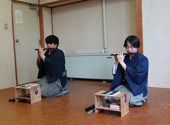 最初はなかなか音が出ないと言われる笛(能管)ですが、まずは持ち方を教わり、思い切って吹いてみると…音が鳴りました!