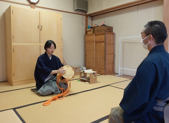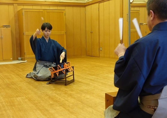 専科では先生と研修生が一対一でお稽古しますが、この日は先生のお声がけで、10期修了者の小鼓方幸清流・寺澤祐佳里さん(写真中央)も加わってのお稽古でした!