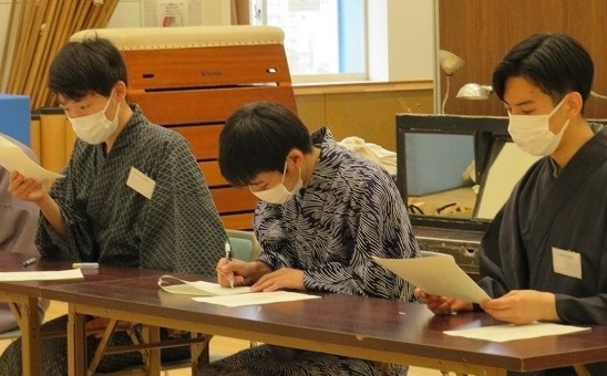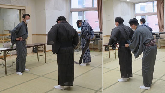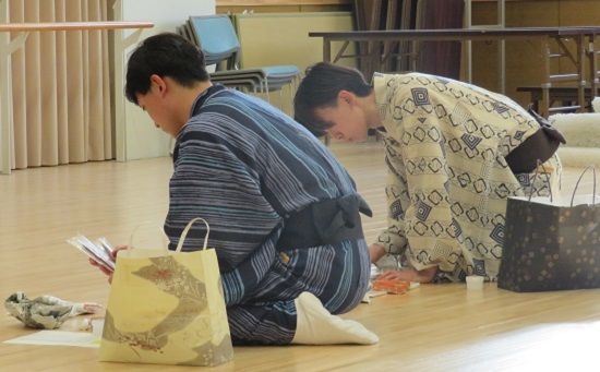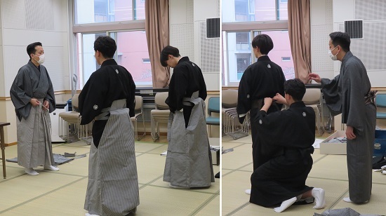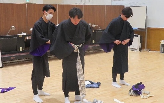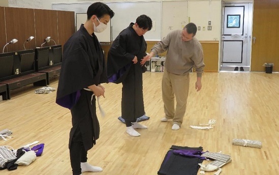 松竹衣裳さんにお越しいただいた日には、合同での衣裳の研修も行いました。