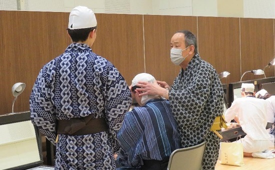 裾の両側に切れ目が入った立廻りを演じる役柄の衣裳・四天(よてん)の着付けを教わります。