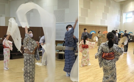 参加者の皆さんが基本の動きから曲に合わせての踊り、小道具・さらしを使った振付まで、日本舞踊を楽しくたっぷり“やってみる”この企画。
