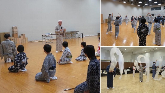 右上:尾上松太郎先生、坂東玉雪さん、市川新十郎さんによる歌舞伎立廻り体験