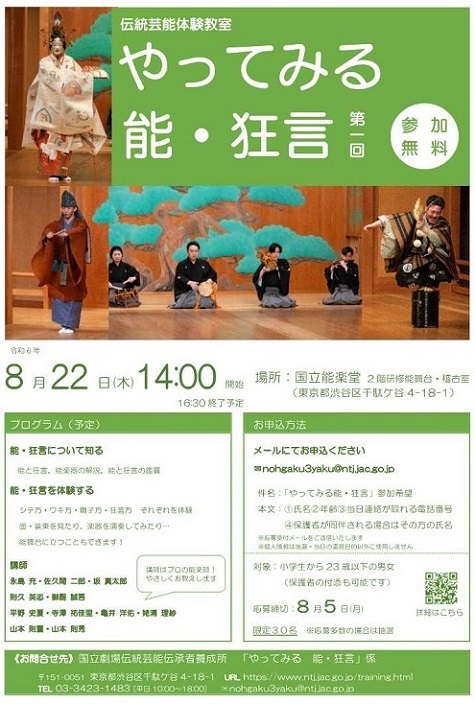 シテ方・ワキ方・囃子方・狂言方のすべてを一度に体験できる貴重なチャンス!