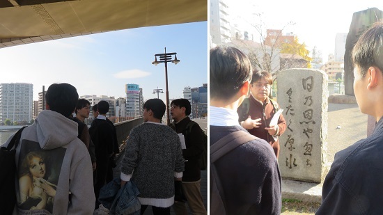 今回、歌舞伎俳優研修生6名は、江戸の歴史と生活について理解を深めるため、演芸評論家の瀧口雅仁(たきぐち・まさひと)先生のご案内で両国・深川を散策しました。