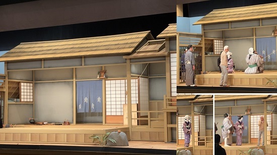 (左:舞台セット/右:舞台稽古での中村萬壽先生、中村芝翫先生によるご指導)