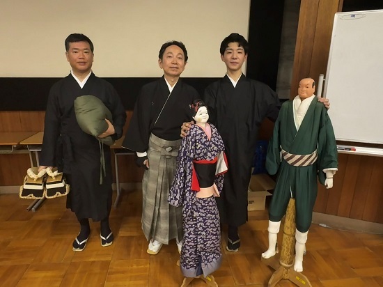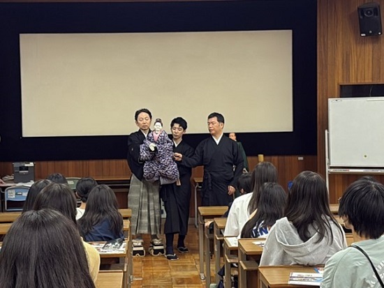 芸能文化科のみなさんに、立役の人形を用いて、主遣い・左遣い・足遣いを体験してもらいました。