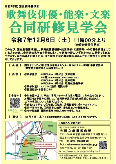 歌舞伎俳優研修・能楽研修・文楽研修への応募を検討されている方を対象に合同研修見学会を開催します。各研修分野のいずれかのみの見学でも参加できます。