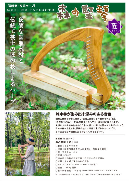 製作を依頼していた皆川氏に、先にハープの基本的な作り方を把握していただくため、国産材15弦ハープ5台の製作をお願いしており、素晴らしい作品を作ってくださいました。