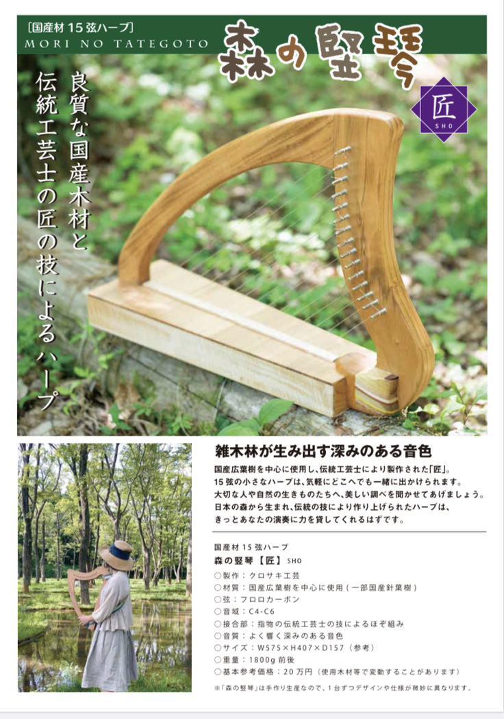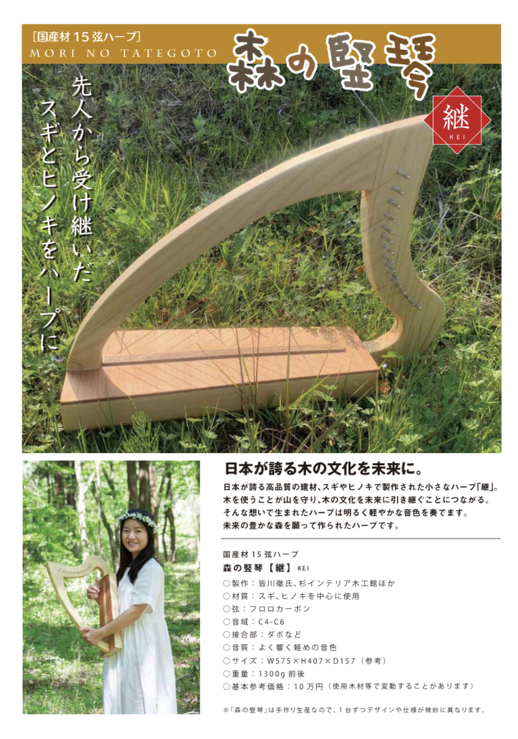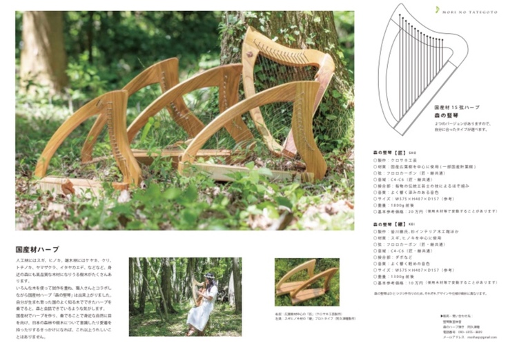 今後とも、国産材ハープの製作、販売、演奏によって、