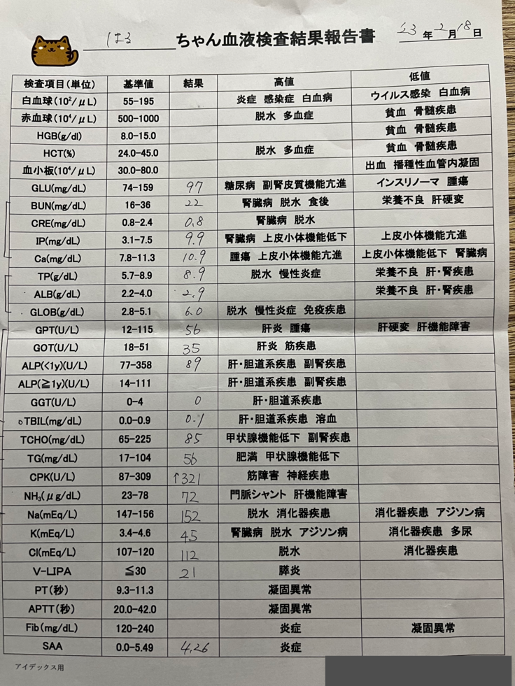 しかし血液検査での数値に異常が見られ、血清アミロイドA蛋白(SAA)の数値が異常に高く、また正常値が0.75以上であるA/G比が0.55であるため、「猫伝染性腹膜炎(FIP)」である可能性が高いという見解。