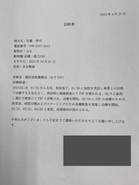 またFIPという病気に効果のある薬が、国内で認可されることを強く願っています!