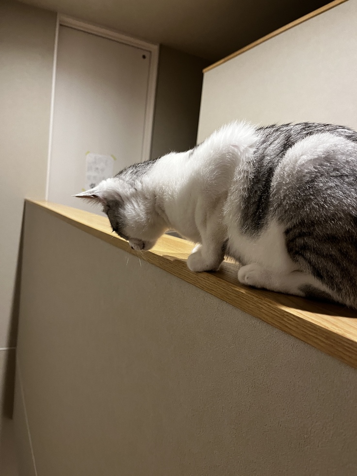今日は階段の上で遊んでいましたが、高所恐怖症の猫っていないんでしょうかね?😅