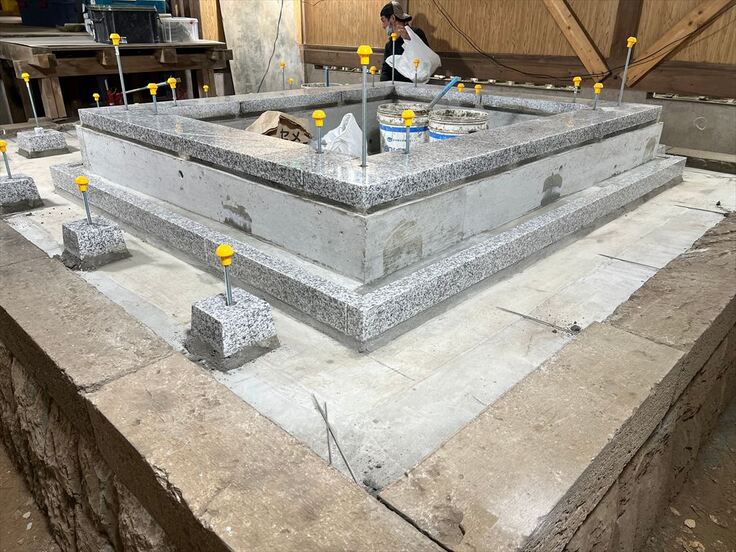その後、基礎部分が完成し、基礎からの立ち上がり、石工事に備えた墨出し作業が実施されました。これにより、次なる工程への正確な準備が整えられました。