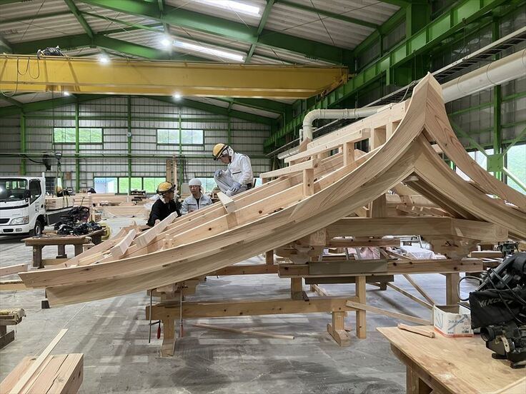まず、5月30日には加工場にて屋根部分の仮組みが行われました。精巧な木組みによって、美しい曲線を描く屋根の形が確認されました。