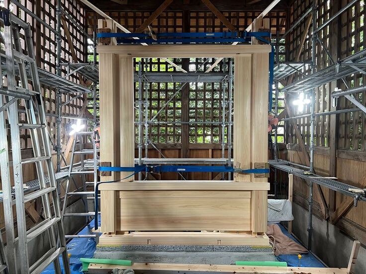 そして8月25日、御本殿の正面がついに完成し、その堂々たる姿が現れました。金具も取り付けられ、格調高い佇まいが整いました。