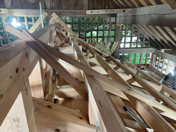 6月20日には、棟木・母屋・登り梁といった上部構造が組み上げられました。木材同士がしっかりと組み合わさり、御本殿の骨組みが完成していきました。